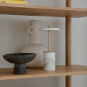 Μοντέρνο επαναφορτιζόμενο επιτραπέζιο φωτιστικό, εσωτερικού χώρου, τελευταίας τεχνολογίας με 10ετή εγγύηση. Έχει λευκό μαρμάρινο κύλινδρικο ως βάση, σώμα μεταλλικό χρυσό και στρογγυλή πλακέ κεφαλή σε χρώμα λευκό, LED θερμό φως 2600Κ με CRI 92. Έχει θύρα USB και κουμπί χειρισμού στη βάση και στη συσκευασία συμπεριλαμβάνεται φορτιστής και USB type C καλώδιο.