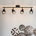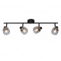 Φωτιστικό οροφής ράγα από μαύρο μέταλλο μήκους 75cm με 4 σποτ. Το υλικό των σποτ είναι γυαλί σε απόχρωση φιμέ.